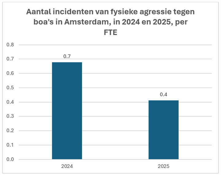De cijfers waar wij ons baseren zijn aangeleverd door de gemeente Amsterdam. Het aantal van 400 FTE is berekend door de gemeente Amsterdam. Daarbij is de gemeente uitgegaan van de formatiecijfers uit de voorjaarsnota ingaande per 1-1-2025, waarbij openstaande vacatures en het ziekteverzuimcijfer er vanaf getrokken zijn, om een zo goed mogelijk beeld te krijgen van de daadwerkelijke bezetting. Het aantal incidenten van fysieke agressie is ook aangeleverd door de gemeente Amsterdam. Het ging in 2025 om 158 incidenten. In 2024 ging het nog om 260 incidenten. Het aantal FTE in 2024 is berekend op basis van het aantal FTE in de voorjaarsnota. Het aantal FTE lag in 2025 (730 FTE) 4.4% hoger dan in 2024 (700 FTE). Het aantal FTE in 2024 is daarom berekend op 384 FTE. De tabel laat zien dat er in 2025 0.4 incidenten van fysieke agressie tegen boa's per FTE waren, tegenover 0.7 in 2024. Alle bovenstaande informatie is voorlegd aan en feitelijk juist bevonden door woordvoerders van de gemeente Amsterdam.